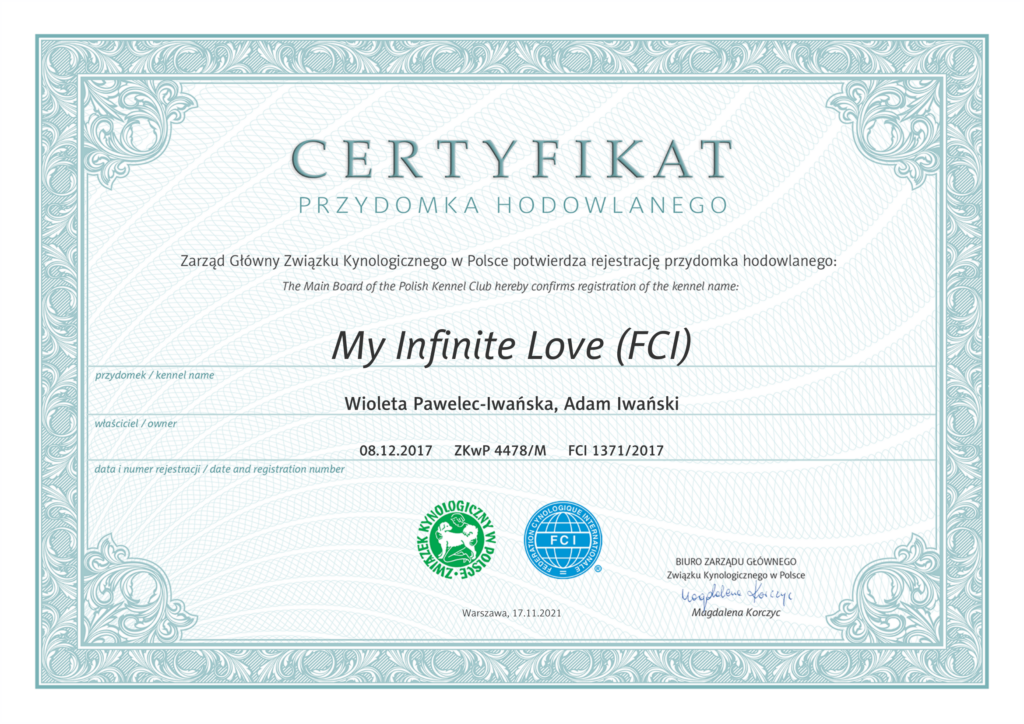 Jesteśmy hodowlą zarejestrowaną w ZKwP, jedynym stowarzyszeniu w Polsce będącym członkiem Międzynarodowej Federacji Kynologicznej – FCI.
